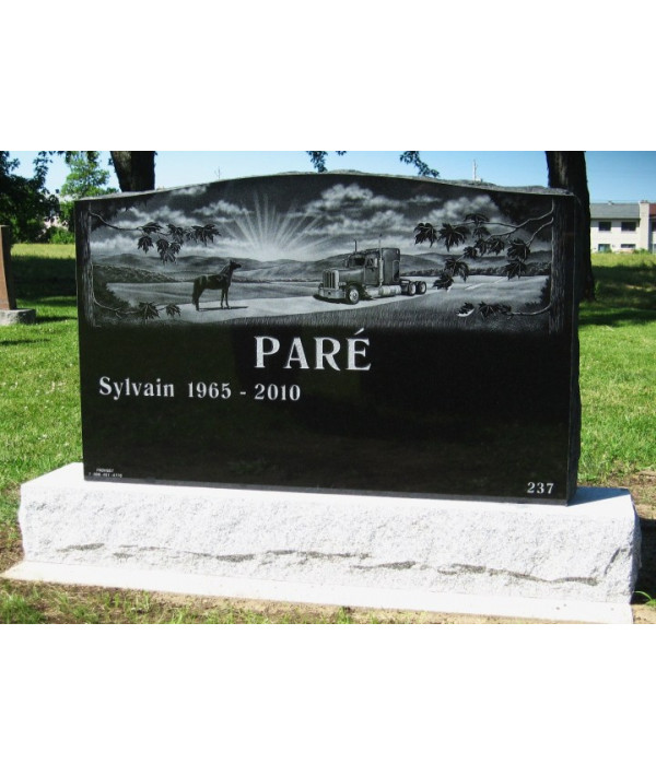 Ce monumnet funéraire vous offre une magnifique scène dun cheval au soleil levant avec un camion qui exprime bien la passion de la personne décédée. Ce monument funéraire vous est offert en granit noir de première qualité, est poli en façade et est rustique sur les côtés. Notez que le paysage est gravé entièrement à la main.