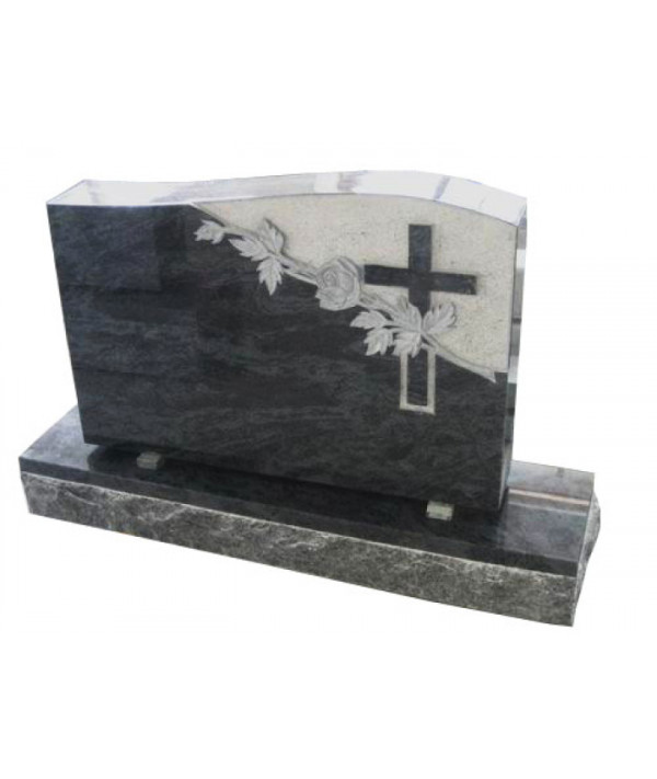 Un granit superbe dans la couleur bleu bahamas mettant en vedette une gerbe de rose accompagnée d'une croix.