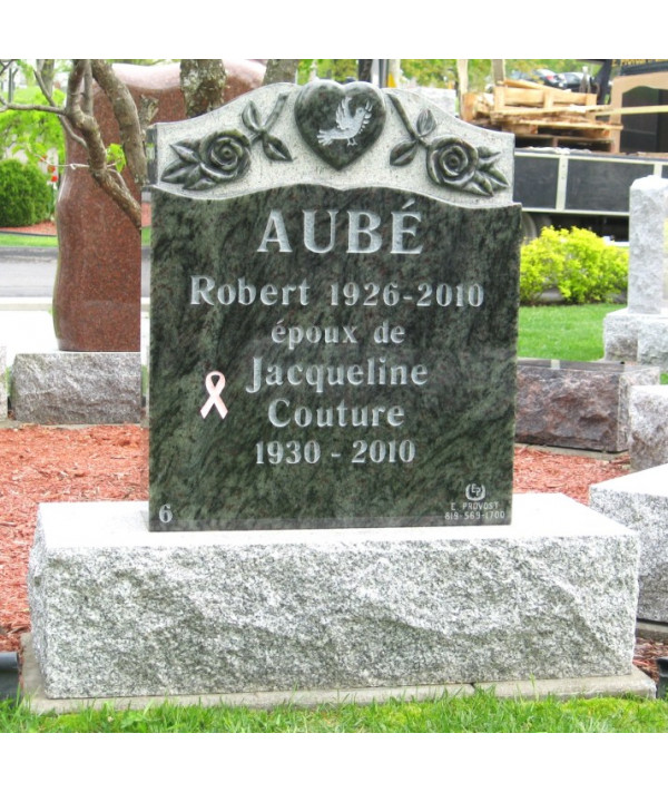 Magnifique monument de couleur vert mettant en vedette une belle gerbe de rose de finition polie.