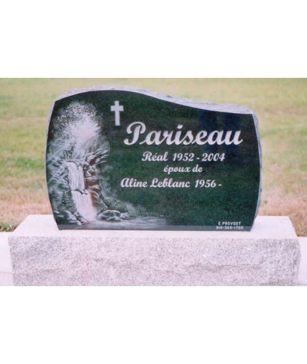 Ce monument funéraire taillé dans un granit de couleur noire, arbore une forme plutôt arrondi, agrémenté dune chute deau tout simplement divine, vous pouvez presque y entendre leau couler. Ce monument funéraire est poli en façade, scié sur le derrière et rustique sur les côtés.