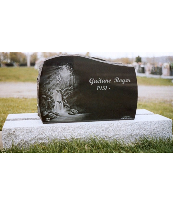 Ce monument funéraire est taillé pour vous dans un magnifique granit de couleur de première qualité, sa forme quelque peu hors du commun, ainsi que sa suface polie à lavant vous offre un merveilleux paysage de chute, doiseaux et de nature. Vous en serez subjugué par le réalisme de cette oeuvre dart.