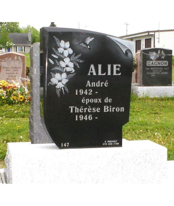 Ce monument funéraire allie sobriété et classe, offert dans un granit de couleur noir, une forme qui sort de lordinaire et une surface entièrement polie. Ce monument a été gravé à la main afin de vous offrir une magnifique gerbe de fleur avec un oiseau mouche à la recherche de nectar. Avec les moindres détails de cette oeuvre cest comme si elle prenait vie.