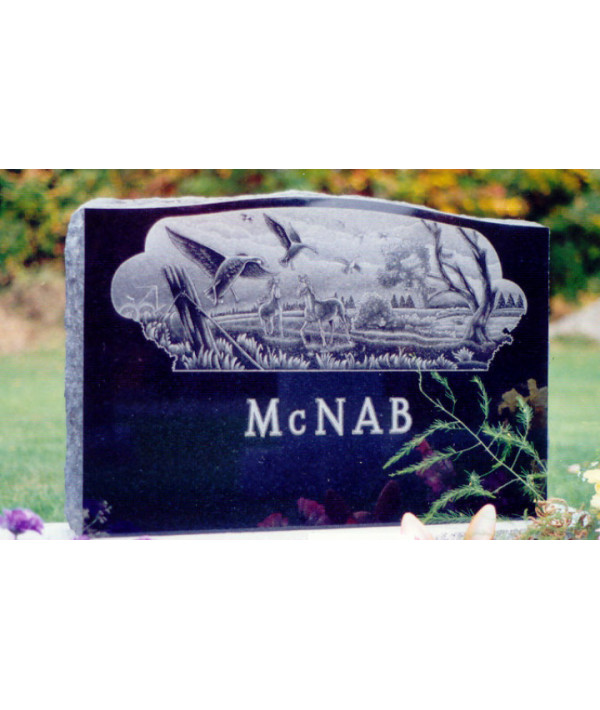 Ce monument funéraire de forme serpentin, son fini poli au devant, scié au derrière et bosselés sur les côtés, vous met en avant plan une magnifique gravure représentant des chevaux, des oiseaux et tout ce que la nature a de mieux à offrir, le tout fait à la main directement sur un granit noir de la plus haute qualité.