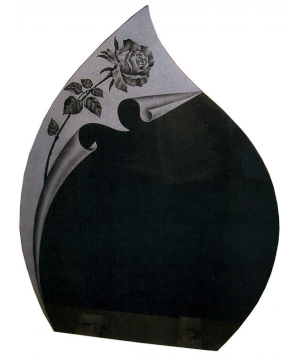 Ce monument funéraire à la forme de type goutte deau ce démarque de par sa couleur noire et son polissage sur toutes les surfaces. Une magnifique gravure au burin fait à la main directement sur la pièce de granit représente une rose qui épouse bien les courbes du monument funéraire. Installation de Monuments Funéraires