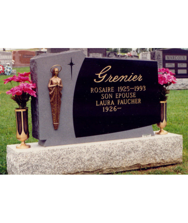 Un monument de granit noir dans une forme plutôt contemporaine mettant en valeur une somptueuse statue de bronze.