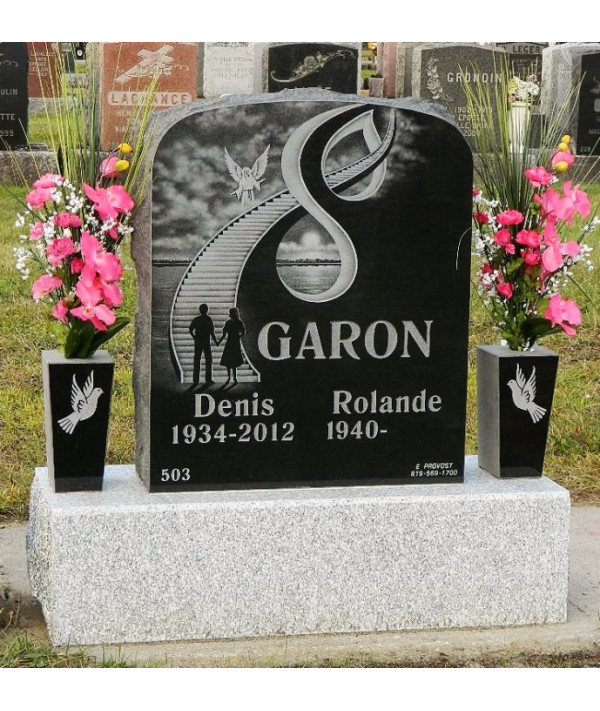 Ce monument funéraire à la forme arrondie est taillé dans un granit de couleur noir, représentant un couple marchant main dans la main vers le paradis, il évoque bien l'amour de deux personnes qui vivait lune pour lautre. Il est possible de rehausser la beauté de votre monument funéraire à la façade polie en y ajoutant de très beaux vases à fleurs.