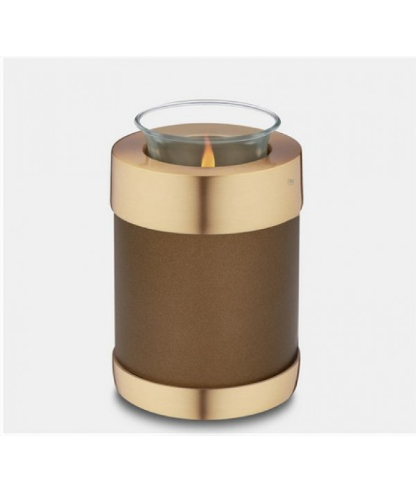 Bougie à réchaud au fini auburn, accentué de laiton antique brossé or.
