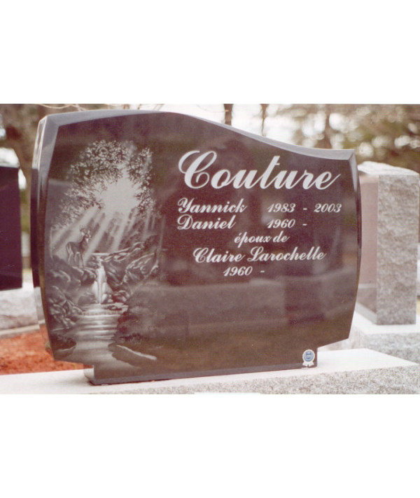 Ce monument funéraire de style classique avec ses formes intemporelles, son ensemble poli et son magnifique granit de couleur noir vous est présentez avec une sublime gravure au burin faite à la main directement sur la pierre.