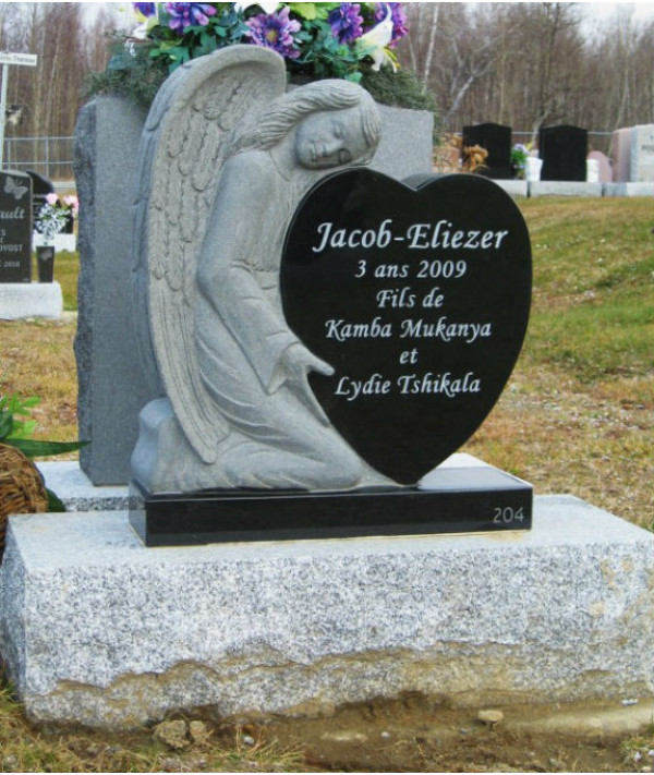Cet ange entièrement sculpté tient dans ses bras un coeur en granit noir.
