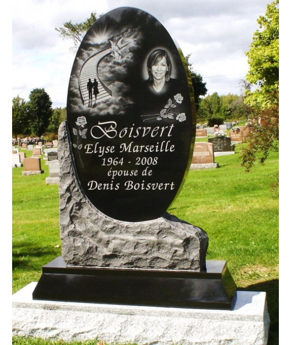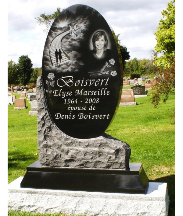 Ce monument funéraire a été conçu pour une personne unique. Ce monument représente un couple uni marchant vers lescalier du paradis, avec sa forme ronde il exprime de belle façon le cycle de la vie. Offert ici dans un granit noir de première qualité, il est poli sur lensemble de sa surface, il repose également sur deux bases de granit dont lune de la même couleur que le monument et la seconde dans une couleur grise afin de bien contraster loeuvre dart.
