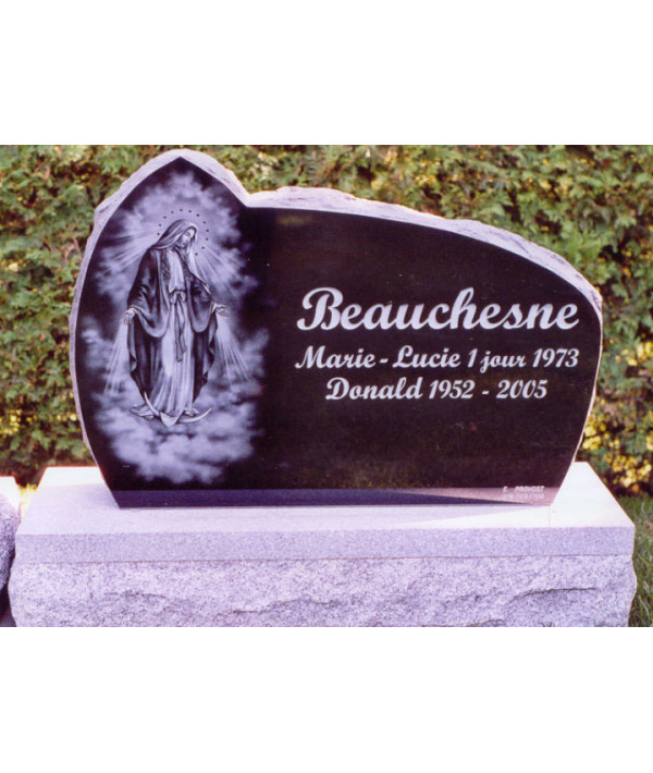 Ce monument funéraire vous est offert dans une forme non conventionnelle mais tout de même très intemporelle, présenté dans une couleur noire afin de maximiser le contraste de la gravure de la sainte vierge faite à la main. Vous pourrez apprécier aussi les contours au relief bosselés.