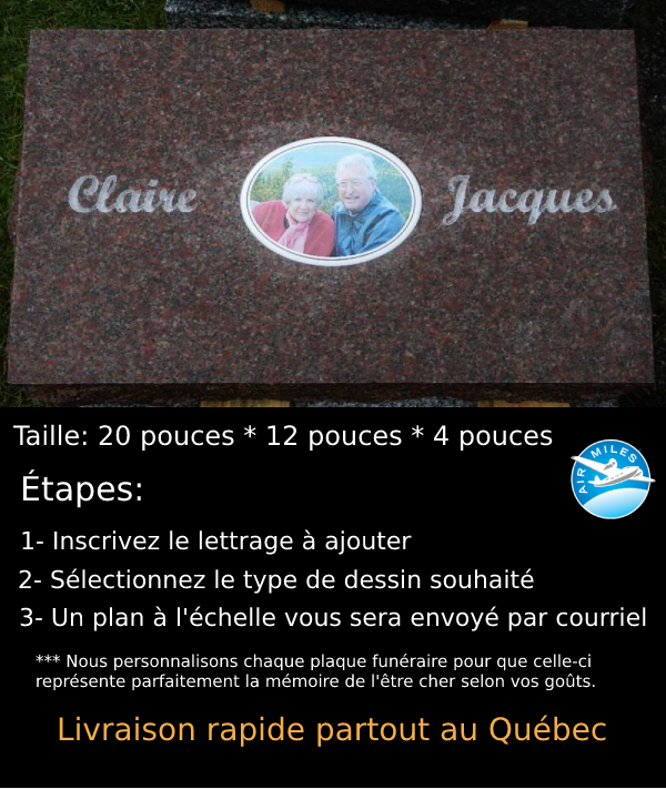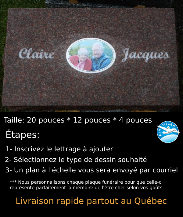 Plaque funéraire de couleur Rouge Indien incluant une photo sur porcelaine encastrée. La grandeur de la plaque est de 24''x12''x4''. Le dessus de la plaque est polie, le dessous est scié et les contours sont rustiques. Notez que la grandeur, le dessin et la couleur de granit utilisé peuvent être modifiés.