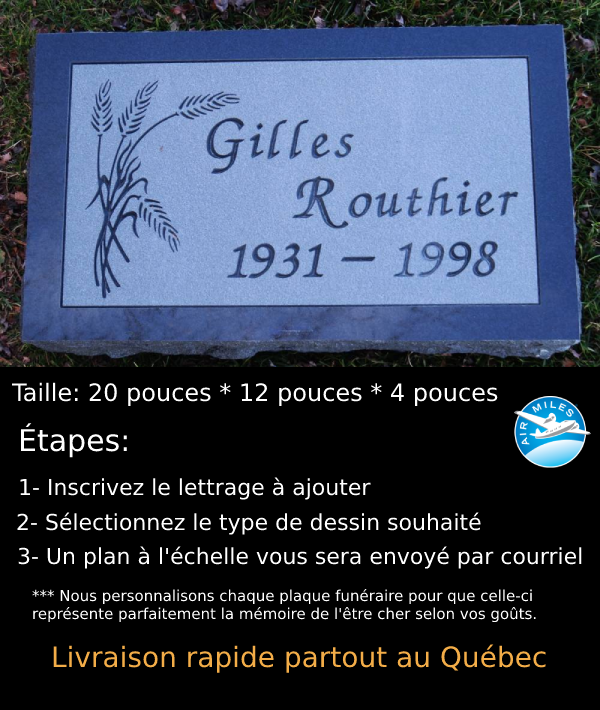 Plaque funéraire de couleur noire selon les dimensions: 20''x12''x4'' le dessus de la plaque est polie, le dessous scié et les contours rustiques. Notez que le dessin ou la couleur du granit utilisé peuvent être modifiés selon vos goûts et vos besoins.