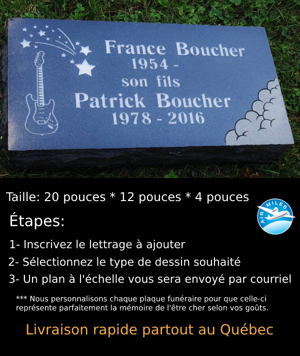 Plaque funéraire de couleur noire selon les dimensions: 20''x12''x4'' le dessus de la plaque est polie, le dessous scié et les contours rustiques. Notez que le dessin ou la couleur du granit utilisé peuvent être modifiés selon vos goûts et vos besoins.