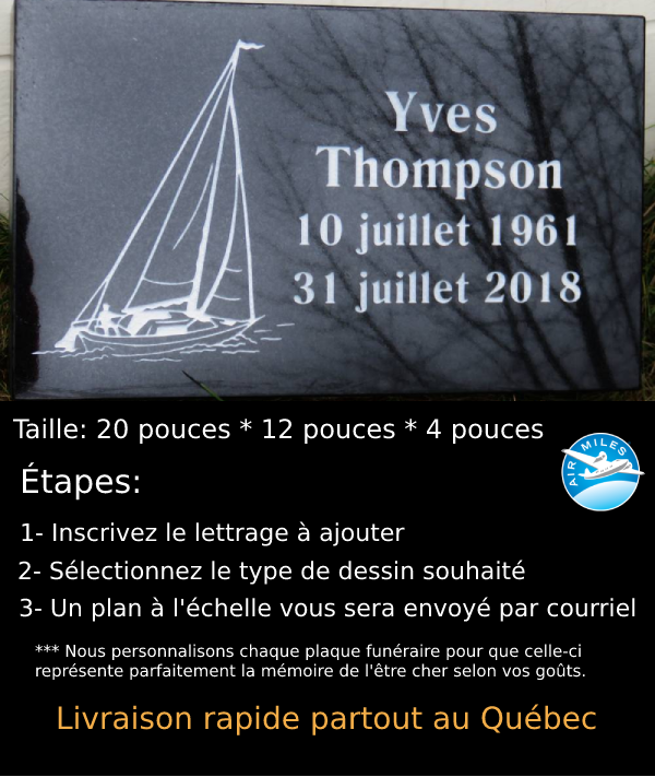 Plaque funéraire de couleur noire selon les dimensions: 20''x12''x4'' le dessus de la plaque est polie, le dessous scié et les contours rustiques. Notez que le dessin ou la couleur du granit utilisé peuvent être modifiés selon vos goûts et vos besoins.