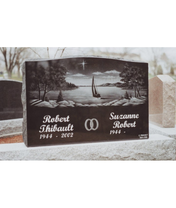 Ce monument funéraire vous est présenté dans une forme traditionnelle, son granit noir et et sa façade polie vous offre comme paysage un merveilleux voilier voguant sur leau avec autour un décor des plus enchanteurs.