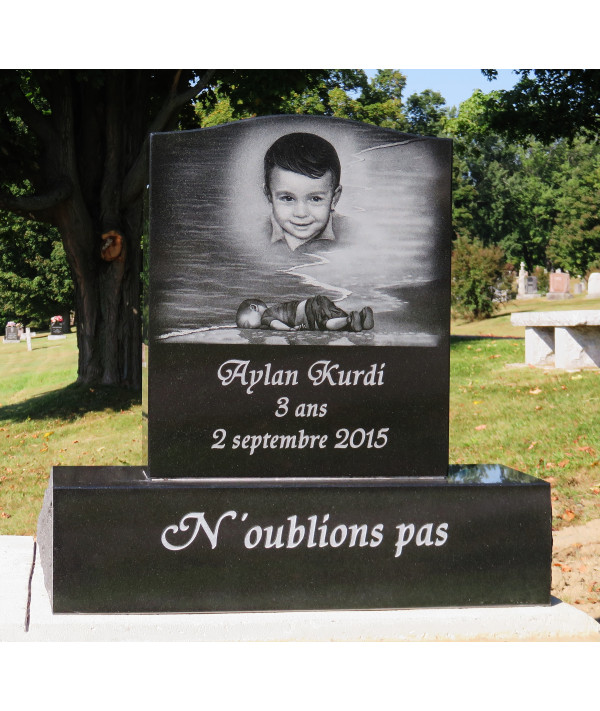 ce monument représente ce petit garçon Syrien retrouvé sans vie sur une plage de Turquie en 2015. Tous se souviennent de cet évènement... La preuve que monuments funéraires peut vous accompagnez afin de vraiment représenter lêtre cher qui est disparu.