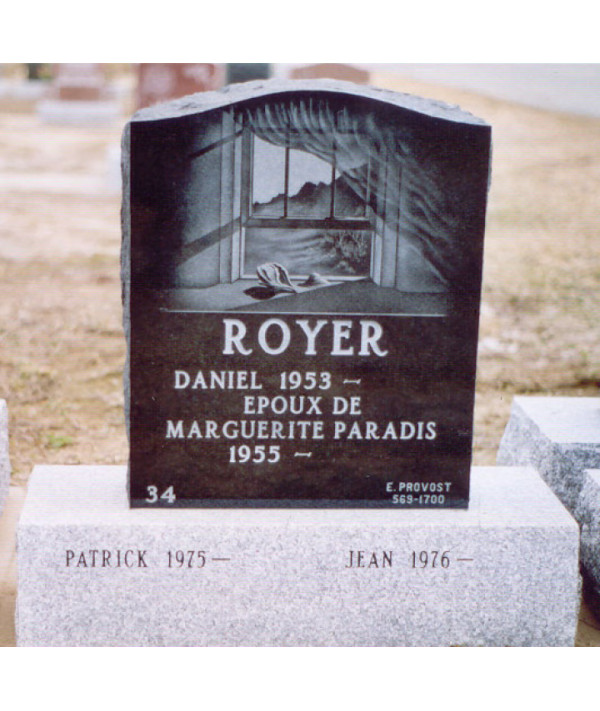 Ce monument funéraire de forme très classique, vous est offert dans une magnifique couleur noire, son fini est poli en façade et rustique sur les côtés. La gravure au burin de la fenêtre et du rideau qui vole au vent exprime très bien lunicité de la personne pour qui il a été conçu. Un modèle hors de lordinaire pour une personne qui était très spéciale à vos yeux.