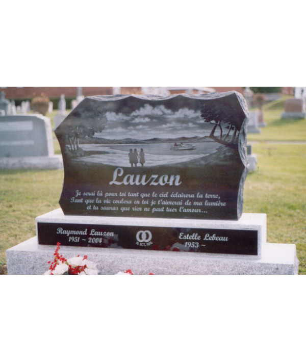 Ce monument funéraire taillé dans un granit noir de grande qualité offrant une façade polie et des côté bosselés vous est présenté sur 2 base de granit au lieu dune. Ce monument funéraire arbore un magnifique paysage représentant un endroit rêvé au bord du lac.
