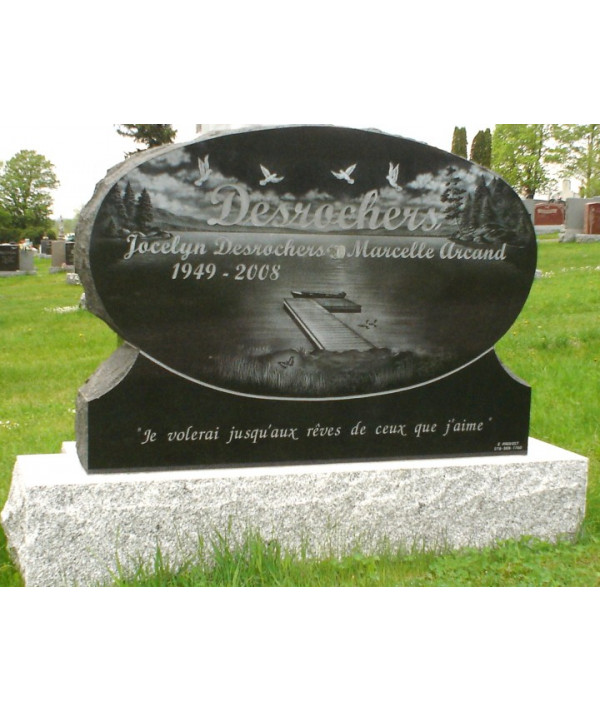 Ce monument funéraire taillé dans un granit noir de haute qualité pour obtenir cette magnifique forme, est poli sur ces 2 faces et ses contours sont rustiques. Une magnifique gravure faite à la main arbore la devanture représentant un sublime paysage dun quai au bord dun lac avec en arrière-plan la cîme des montagnes.