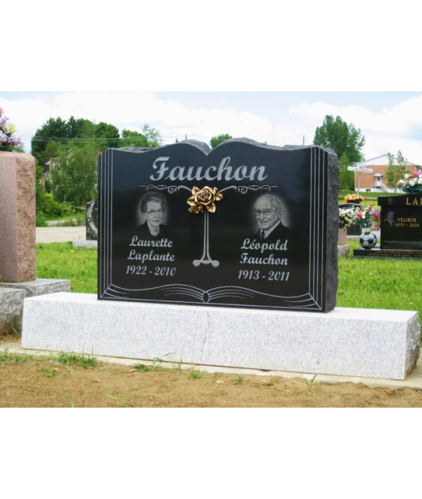 Ce monument funéraire à la forme dun livre, ici présenté dans un granit noir et poli sur sa surface avant est agrémenté du portrait de chacune des personnes décédées tel une photo que vous auriez prise. Le tout agrémenté dune somptueuse rose sculptée en bronze. Parce que chaque personne est unique ce monument funéraire lest tout autant.