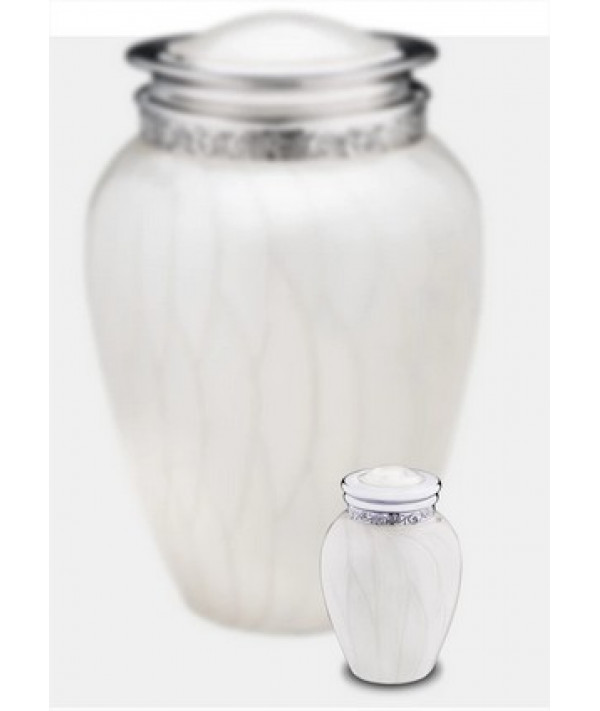 L'urne Tendre Hommage nacré argenté (reliquaire) présente une finition nacrée lisse appliquée à la main, ornée d'une magnifique bande gravée à la main autour du couvercle de l'urne. Le design épuré et créatif de cette urne présente une curieuse combinaison d'éléments classiques et modernes. C'est une urne magnifique qui créera un mémorial paisible et chaleureux pour votre être cher.