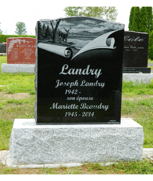 Ce monument de granit noir est entièrement poli. Il vous offre un magnifique paysage de nature agrémenté dun parchemin.